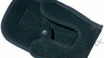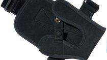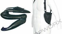 Fabrication d'armes en caoutchouc dur peintes en bronze foncé avec patine turquoise et détails violets sur l'extrémité. A des trous à bulles et des taches rugueuses du processus de coulée et montre l'usure de l'utilisation de production. Mesures 8.5in x 7.25in x 2in. Production faite étui en nylon noir avec sangle noire réglable et sangles élastiques et Velcro, clips Fastex et anneaux, et panneau d'épaule en cuir noir, holster mesures environ. 8in x 8in x 2in.