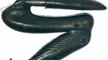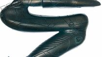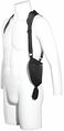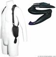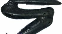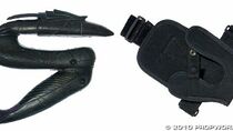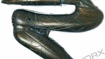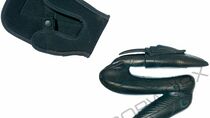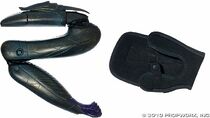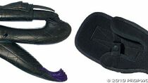 Arme en caoutchouc mousse peinte en bronze foncé avec patine turquoise et des détails violets sur l'extrémité. A des trous à bulles et des taches rugueuses du processus de coulée et montre l'usure de l'utilisation de production. Mesures 8.5in x 7.25in x 2in. Étui en nylon noir fabriqué avec sangle noire de 1 po, sangle Snap et Velcro et sangle noire de 2 po et boucle de ceinture Velcro. Mesure environ. Sangle noire de 9,25 po x 6,5 po x 2,5 po. Sangle noire de 1,5 po x 27,25 po et ceinture Velcro avec boucles en plastique. Sangle noire de 2 po x 13,5 po et ceinture Velcro avec boucle en plastique.