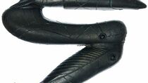 Arme en caoutchouc de production peint bronze antique avec patine turquoise et pourpre détaillant à l'extrémité, montre l'usure de l'utilisation de la production, y compris la peinture peeling et les fissures, mesures environ. 8,75 po x 7,5 po x 2 po.