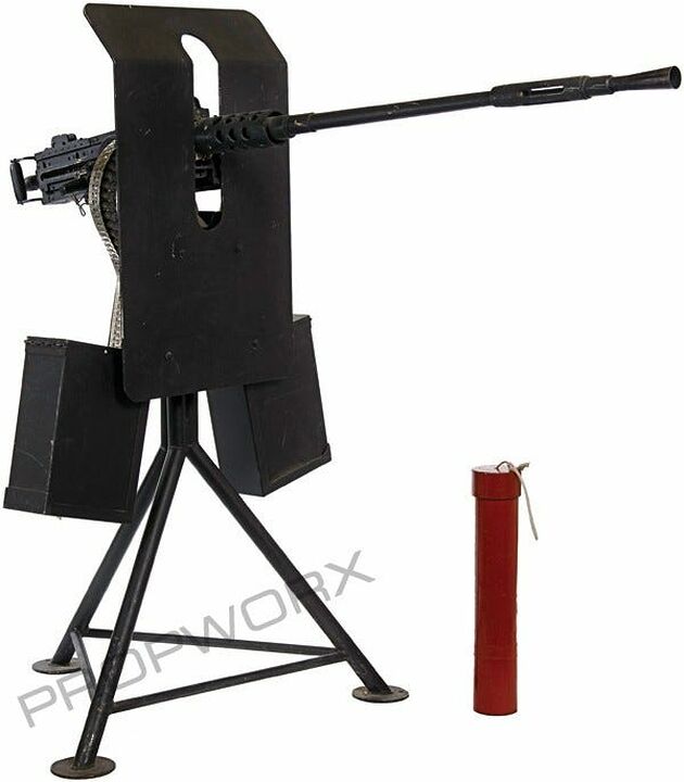 Cette pièce est fabriquée à partir de métal, de bois et de résine.Elle est dotée d'un trépied avec deux grandes caisses de munitions de chaque côté, le corps principal de la mitrailleuse étant alimenté par de fausses balles. Comprend long barillet avec bouchon de canon rouge. Pièce est de couleur noire avec des accents d'argent et de métal. Mesures 71in x 79in x 38in.