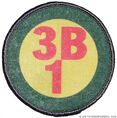 Pièce rapportée fabriquée avec la phrase "3B1" en rouge et placée dans un cercle jaune avec un anneau extérieur vert. Mesure 2,5 en cercle.