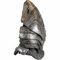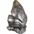 Casque en caoutchouc dur fabriqué en série avec doublure en satin noir. Peint en argent avec des accents dorés cet article dispose d'usure de la production. Mesure 26po x 25po x 15po.