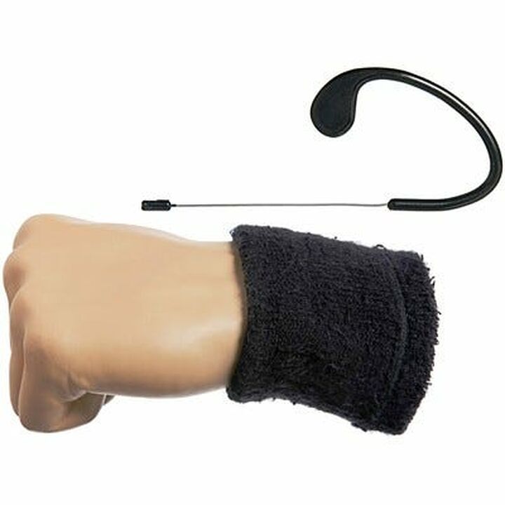 Ensemble de deux articles dont : bracelet en coton stretch noir avec logo brodé à l'intérieur, fabriqué par Nike. Écouteur en plastique noir fabriqué en série avec tige métallique intégrée, sur le dessus de la tige est un faux microphone en plastique noir, mesure 3.75in x 1.5in.