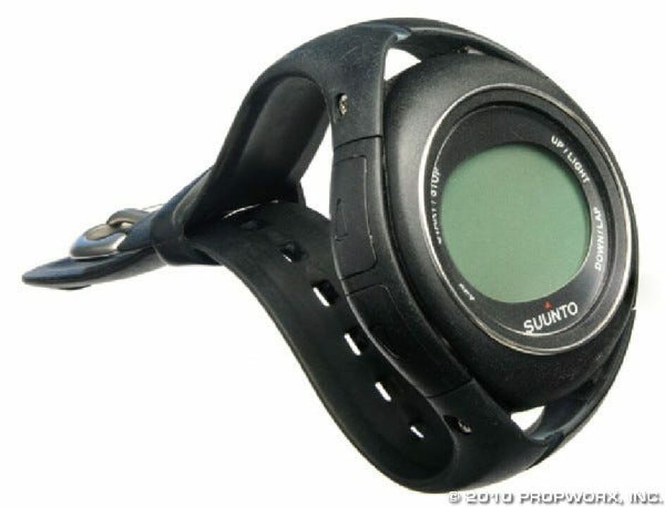 Montre de sport numérique en plastique noir avec bracelet en caoutchouc noir avec boucle en métal, la fonctionnalité est non vérifiée, fabriqué à Hong Kong par Suunto, mesure environ. 5,25 po x 2,5 po x 2 po.
