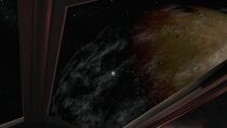 Vue depuis l'espace, cette planète reflète une couleur rouge-orangée suggérant un monde aride et désertique dépourvu de grandes étendues d'eau. Delmak est située près d'une grande nébuleuse de couleur bleue et à moins d'une journée de voyage en hyperespace de la planète Vorash.