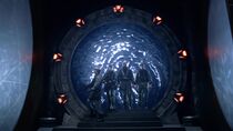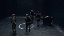 Après avoir obtenu son accord, les membres de l'équipe SG-1 traversèrent la porte des étoiles et débarquèrent à l'intérieur d'une unique pièce relativement sombre. Toutefois, après quelques minutes d'exploration infructueuses, le colonel O'Neill décida de rentrer sur Terre et déclencha malgré lui l'apparition d'un dispositif sur l'un des murs de la salle en enjambant l'inscription circulaire - écrite dans la langue des Anciens - qui ornait le sol au centre de la pièce.