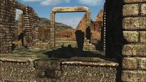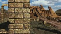 À noter que l'on peut apercevoir deux collines au terrain escarpé et dénudé qui surplombe la vallée dans laquelle sont situées les très nombreuses ruines, ainsi que la porte des étoiles.