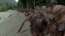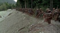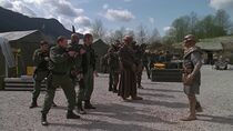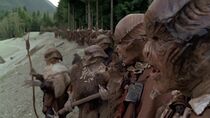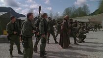Quelques minutes plus tard, lorsque le docteur Jackson revint au campement terrien, celui-ci essaya de convaincre à nouveau le colonel Edwards d'évacuer immédiatement la planète. Néanmoins, alors que le militaire refusa d'entendre raison, plusieurs centaines de Unas, dirigés par Kor Asek, encerclèrent les hauteurs du campement terrien, prêts à passer à l'attaque. Kor Asek se dirigea alors seul vers le docteur Jackson qui ordonna au colonel Edwards et à ses hommes de se rendre et de s'agenouiller en guise de respect devant le chef unas. Celui-ci entama alors de nouvelles négociations avec l'archéologue terrien et Chaka au milieu du campement terrien.