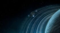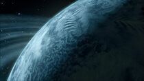 Vue depuis l'espace, cette étrange planète comportant un reflet bleuté est entourée par une ceinture d'anneaux de glace et de poussière, similaires à ceux de Saturne dans notre système solaire, et semble abriter un immense continent verdoyant.