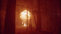 Un campement rudimentaire composé de plusieurs tentes en toile est installé à proximité de la porte des étoiles locale et semble être entouré d'une dense forêt de conifères.