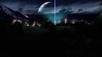 Vue depuis l'orbite, cette planète est constituée d'au moins un grand continent, ainsi que d'importantes étendues d'eau et semble orbiter autour d'une étoile de couleur bleue.