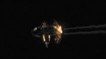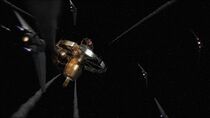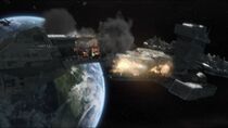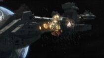 Alors que l'arme commença à se recharger, un escadron de F-302 commandé par le colonel Mitchell décolla du Prométhée et attaqua le satellite ori, mais sans provoquer le moindre dégât. Cependant, bien que le colonel Carter et le capitaine Marks tentèrent de réparer les moteurs subluminiques, le président Nadal ordonna de cibler à nouveau le vaisseau terrien et un second tir frappa à nouveau le Prométhée, provoquant une dépressurisation importante de certains niveaux. Le colonel Pendergast transmit alors un message radio aux dirigeants du protectorat de Rand pour leur soumettre leur réédition, mais le président Nadal et le commandant Pernaux menacèrent le docteur Jackson et Jared Kane de leur fournir des informations au sujet des espions calédoniens infiltrés dans leur rang sous peine de détruire le Prométhée.