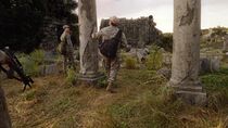 Alors qu'ils marchèrent au sein des couloirs sombres et instables, Eli signala aux autres que le Kino avait enfin trouvé une sortie vers l'extérieur et Chloe remarqua qu'un plan des galeries était régulièrement affiché sur les murs, leur permettant de se repérer. Cependant, au moment où Greer se dirigea seul à l'angle d'un couloir, le plafond de la galerie s'écroula sur lui et le sépara du reste de l'équipe. Bien que Scott, Eli et Chloe tentèrent de dégager un passage, ils furent obligés de quitter la zone très instable et d'abandonner leur ami présumé mort. Ils parvinrent à trouver la sortie et se dirigèrent vers la porte des étoiles. Pendant ce temps, le sergent Greer réussit à s'extirper des décombres et à sortir à son tour des galeries souterraines.