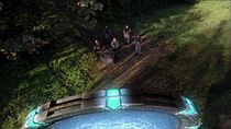 La porte des étoiles locale est située au milieu d'une grande clairière à proximité d'une forêt de feuillus et de conifères. Un sentier part de cette clairière et semble s'enfoncer à travers les bois.