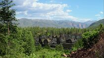 Un petit village est situé au cœur d'une vallée très boisée et entourée par de grandes montagnes verdoyantes et dénudées.