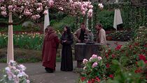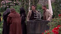 Après avoir traversé la porte des étoiles, les membres de SG-1 rencontrèrent Caius au sein d'un immense jardin florissant près de l'autel sur lequel se trouvait la batterie d'Inago. Vala essaya alors de négocier avec l'ancien contrebandier en lui disant que la légendaire relique qu'elle avait autrefois apportée au temple n'était en réalité d'une batterie de vaisseau cargo mais qu'elle était prête à la reprendre dans le but de se faire pardonner. Toutefois, Caius refusa catégoriquement son offre, prétendant que ce bénitier était l'unique source de revenu pour le temple et que les pèlerins de tout le système se rendaient sur ce monde pour voir cette relique.