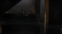 Un autre des plans préférés de Wood se trouve dans la salle des anneaux, lorsque SG-1 est sur le point de faire ses adieux : "Il y a un plan dans la salle des anneaux avec Rick glissant sur le sol, et il fait exploser un insecte juste au moment où il entre dans les anneaux. C'est la fin de mon plan, et la raison pour laquelle il a fait ce qu'il a fait, c'est parce que la salle des anneaux était exactement la même sur les deux vaisseaux. C'est le même décor ! Pour donner l'impression qu'il se passait quelque chose de différent, j'ai dû trouver quelque chose qui couvre complètement le cadre - et nous avons utilisé l'insecte. Ce plan très dramatique est donc né de la nécessité d'utiliser le même décor et de l'impossibilité de sortir et d'entrer dans la salle des anneaux."