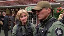[20:06] - On peut remarquer que l'un des figurants, habillé d'un polo de couleur rouge bordeaux, passe à deux reprises derrière les membres de l'équipe SG-1 entre le champ et le contre-champ de la scène.