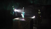 - Alors que le Dr Daniel Jackson affirme qu'Avalon était un lieu où le roi Arthur et ses chevaliers ont rassemblé un grand nombre de richesses et de trésors, Mitchell souligne que l'un de ces trésors était le Saint Graal. Il sera révélé plus tard dans "Le manteau d'Arthur" que le "Saint Graal" était la raison même pour laquelle Merlin avait construit le caveau : il l'utilisait comme laboratoire pour fabriquer le Sangraal, une arme capable de neutraliser un être élevé.