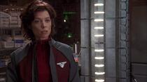 "J'aime toujours les effets", dit Hewlett à propos de la scène finale. "Quand on fait la scène, on se dit : "J'espère que je vais réussir parce que sinon je vais avoir l'air vraiment stupide". C'est donc toujours un plaisir de voir la scène terminée. Je pense que nous avons tourné la partie de la descente des escaliers à la toute fin environ quatre fois, parce qu'au fur et à mesure que les effets progressaient, nous nous sommes rendu compte que certaines choses ne se rapportaient pas correctement à moi. J'ai vu une version, et la créature était en fait une créature - elle avait des qualités de créature, on pouvait voir une tête qui regardait Sheppard à travers l'une des fenêtres. Robert Cooper, je crois, a décidé que non, il s'agissait d'une entité différente de celles auxquelles nous avions eu affaire auparavant. C'est une créature énergétique, pourquoi devrait-elle être confinée à une forme qui nous est familière ?"