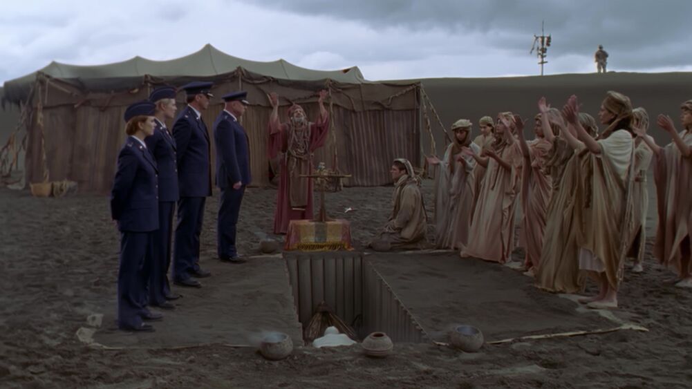 Plusieurs décennies plus tard, en 1996, lorsque le docteur Daniel Jackson parvint à percer le mystère de la porte des étoiles, les militaires américains composèrent les coordonnées de la planète Abydos, autrefois gravées par les anciens Égyptiens sur une dalle de pierre découverte en 1928 par le professeur Langford. Une fois le vortex établi, un robot d'exploration fut envoyé à travers l'horizon des événements, révélant l'existence d'un monde habitable de l'autre côté. Ainsi, une équipe de militaires commandée par le colonel Jack O'Neill, accompagnée du docteur Jackson, traversa la porte des étoiles et débarqua à la surface d'Abydos à l'intérieur de la grande pyramide. Néanmoins, incapables de composer les coordonnées pour rentrer sur Terre, le colonel O'Neill et ses hommes établirent un camp de fortune près de l'édifice.