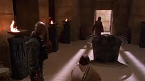 Conscients de l'importance des informations recueillies par Sha're en tant qu'hôte d'Amaunet, le docteur Jackson et Teal'c décidèrent de les ramener sur Terre par la porte des étoiles. C'est alors que le seigneur goa'uld Heru'ur arriva à bord de son vaisseau-mère, empêchant les deux membres de l'équipe terrienne et Sha're de composer une adresse. De plus, le réveil de la goa'uld Amaunet provoqua le début d'accouchement chez la femme du docteur Jackson qui fut emmenée par ce dernier et Teal'c jusqu'aux grottes de Kaleemah pour mettre au monde son enfant. Alors que les Jaffas de Heru'ur fouillèrent le village et les alentours de la pyramide, Sha're donna naissance à un fils avec l'aide du docteur Jackson, provoquant le réveil d'Amaunet. Néanmoins, Teal'c, habillé en garde Horus, neutralisa la Goa'uld avant de lui prendre son enfant pour lui faire croire que celui-ci avait été enlevé par Heru'ur.